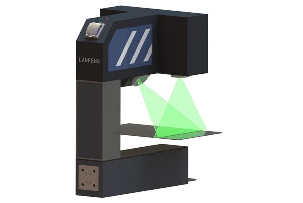 設(shè)備采用工業(yè)相機(jī)測量板材寬度。補(bǔ)光的線性激光垂直設(shè)置,工業(yè)相機(jī)傾斜設(shè)置,用于測量板面呈水平狀態(tài)通過的板材寬度。相機(jī)圖像的長度方向用于測量板材的寬度,圖像的寬度方向用于修正物距(被測物上下波動(dòng)較大時(shí),需增設(shè)激光位移傳感器跟蹤被測物的位置已修正物距)。設(shè)備主要配置上位機(jī)控制系統(tǒng)、外接數(shù)碼管顯示屏,根據(jù)需要可增配嵌入式智能模塊等。設(shè)備下部可配置剪刀叉升降平臺(tái)等輔助設(shè)備。