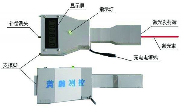 儀器為手持式自動(dòng)測(cè)量設(shè)備,內(nèi)置1只激光測(cè)距儀和1只直線位移傳感器。其中直線位移傳感器為補(bǔ)償測(cè)頭,補(bǔ)償支撐腳與圓弧頂?shù)木嚯x差;激光測(cè)距儀為主測(cè)量傳感器。測(cè)量時(shí)以支撐腳抵住被測(cè)物內(nèi)壁,激光測(cè)距儀測(cè)量?jī)x器至另一側(cè)的距離,該距離與補(bǔ)償測(cè)頭的數(shù)據(jù)相加得到被測(cè)物的內(nèi)徑尺寸。